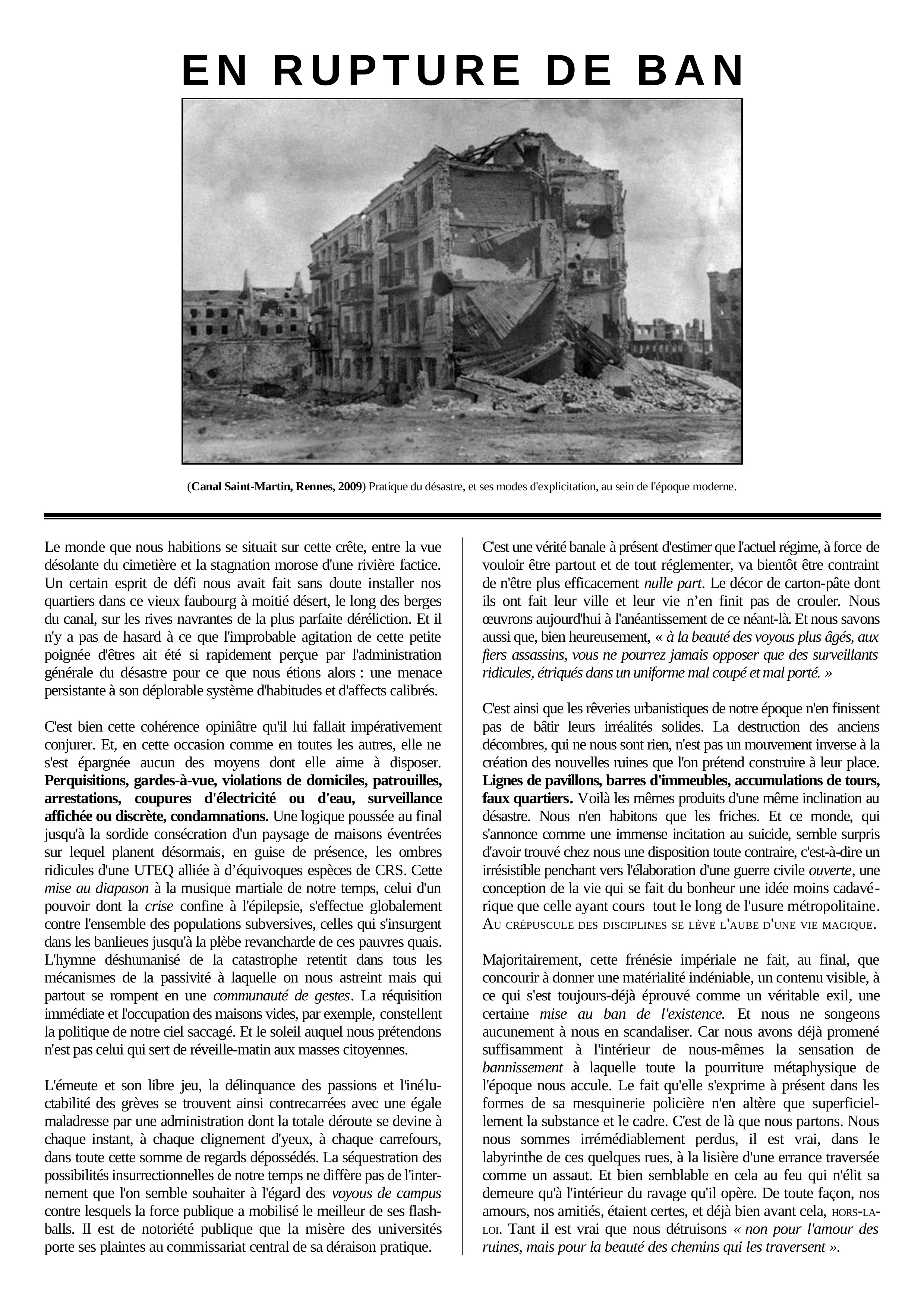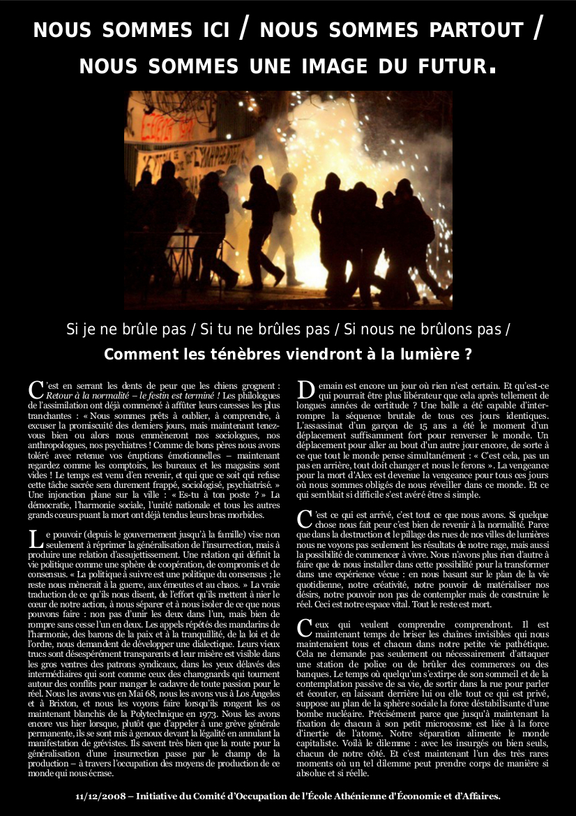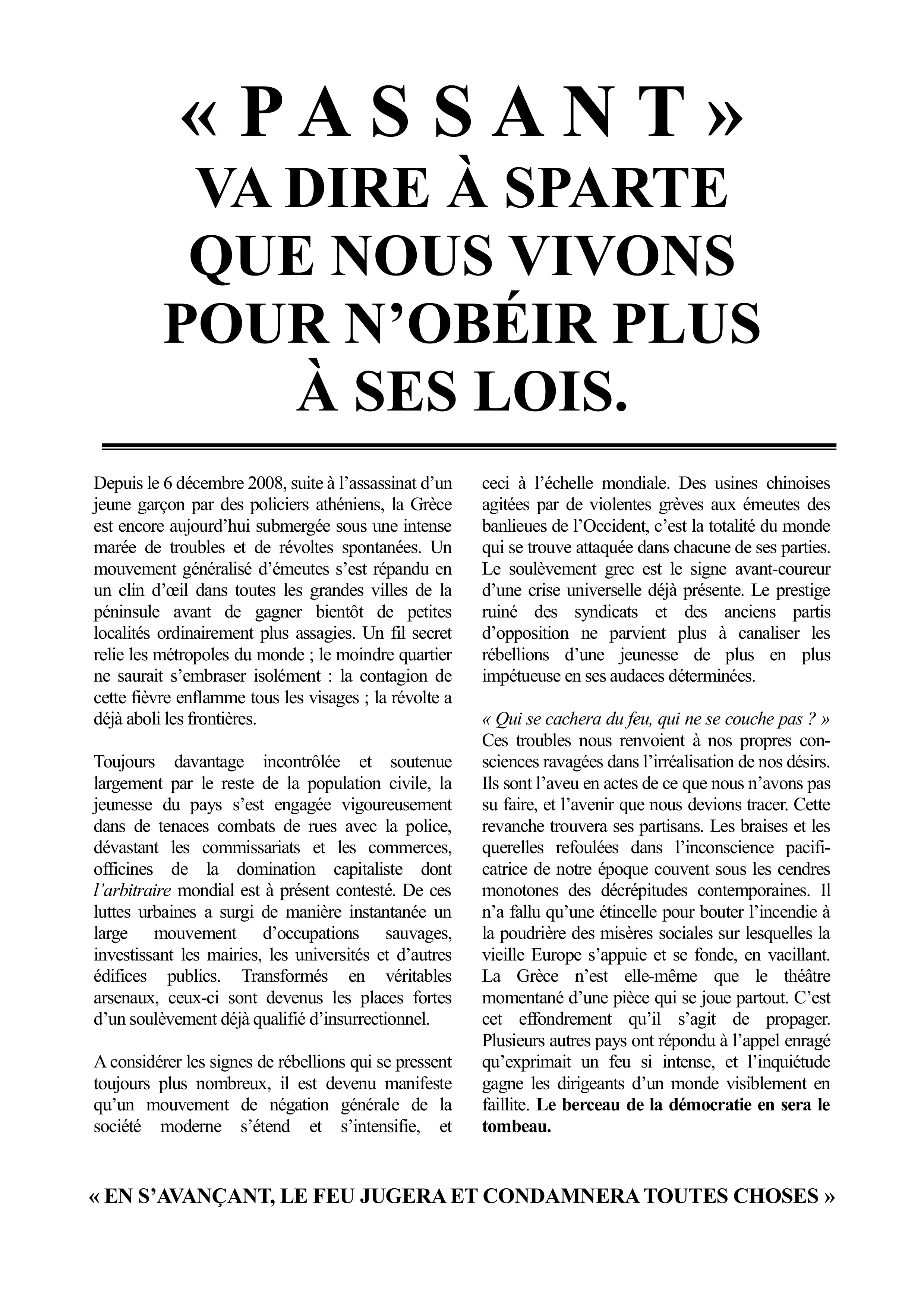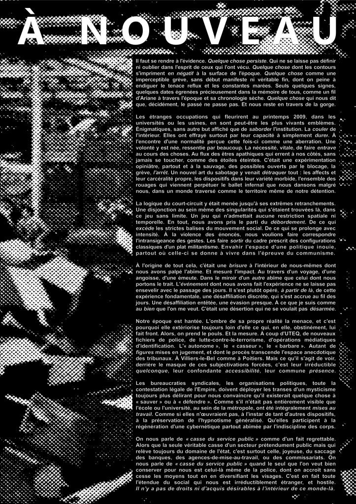 C’est une chose entendue. Le Parti de l’Ordre espère, à toute force, nous faire rentrer chez nous. Syndicats et gouvernement auront réussi à s’accorder. Là-dessus, au moins. Ils tablent sans doute sur l’attirance malheureuse qu’aurait pour nous l’insidieux sentiment de vide dans lequel nous avons si parfaitement désappris de vivre, et de lutter. En cela, ils se trompent. Nous ne rentrerons pas chez nous, nous qui ne nous sentons chez nous nulle part. S’il est bien un seul espace que nous avons aperçu comme habitable, c’est au sein de l’événement grâce auquel nous vivons, dans les intensités qui s’y dessinent. En fonction, surtout, des moyens que nous saurons nous donner.