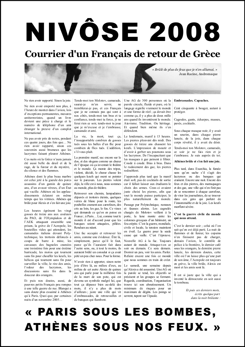 Et puis nos doutes, aussi, de pauvres petits Français peu rompus à une telle guerre de rue. Blanqui a sans doute plus essaimé à Athènes qu’à Paris. Quoi que, par certaines nuits d’un novembre 2005…